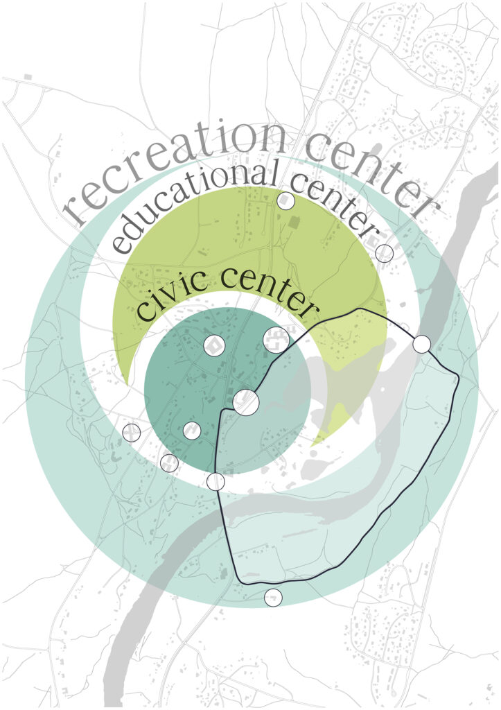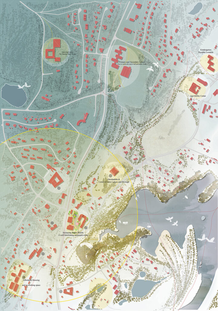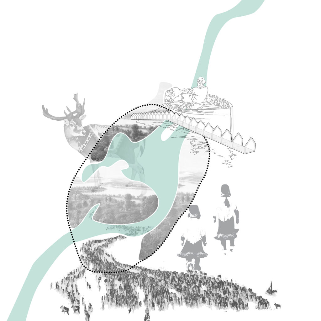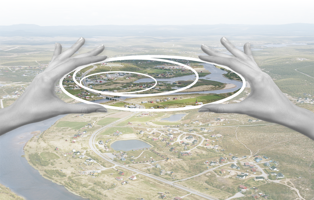 Nesting Centers, comparable to Matryoshka doll, change sizes but not qualities. The civic center remains the core and a ripple effect of programs and spaces gradually merges with the natural surroundings. The civic core is followed by the educational belt, and further the nature accessibility is enhanced by a pedestrian bridge linking two sided of the river. This proposal considers our future inseparable from the positive being of our living environment and stands vigorously for a stage of eco-stability. As Sami have essentially always been nomadic, the center has moved its location often also. However, due to the evolution of ways of living our unique cultures are being asked to adapt and absorb beneficial ideas. Therefore, the perception for the center should be open for interpretation based on our point of interest, physical ability to comprehend it and daily activities and circumstances. A center should not have a strict border, instead it has to be a space of significance and common good.