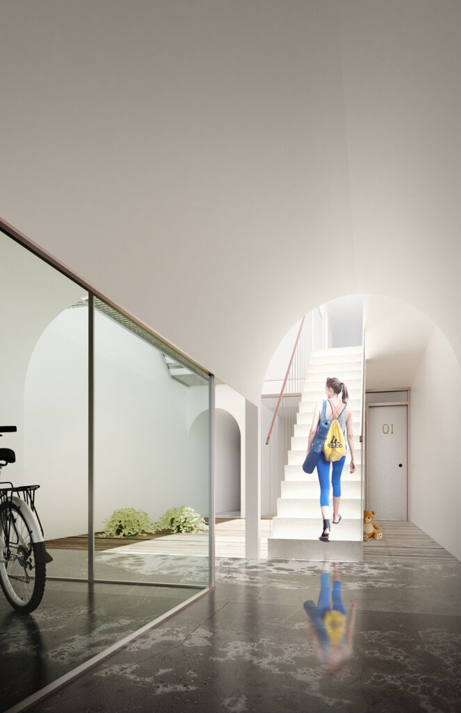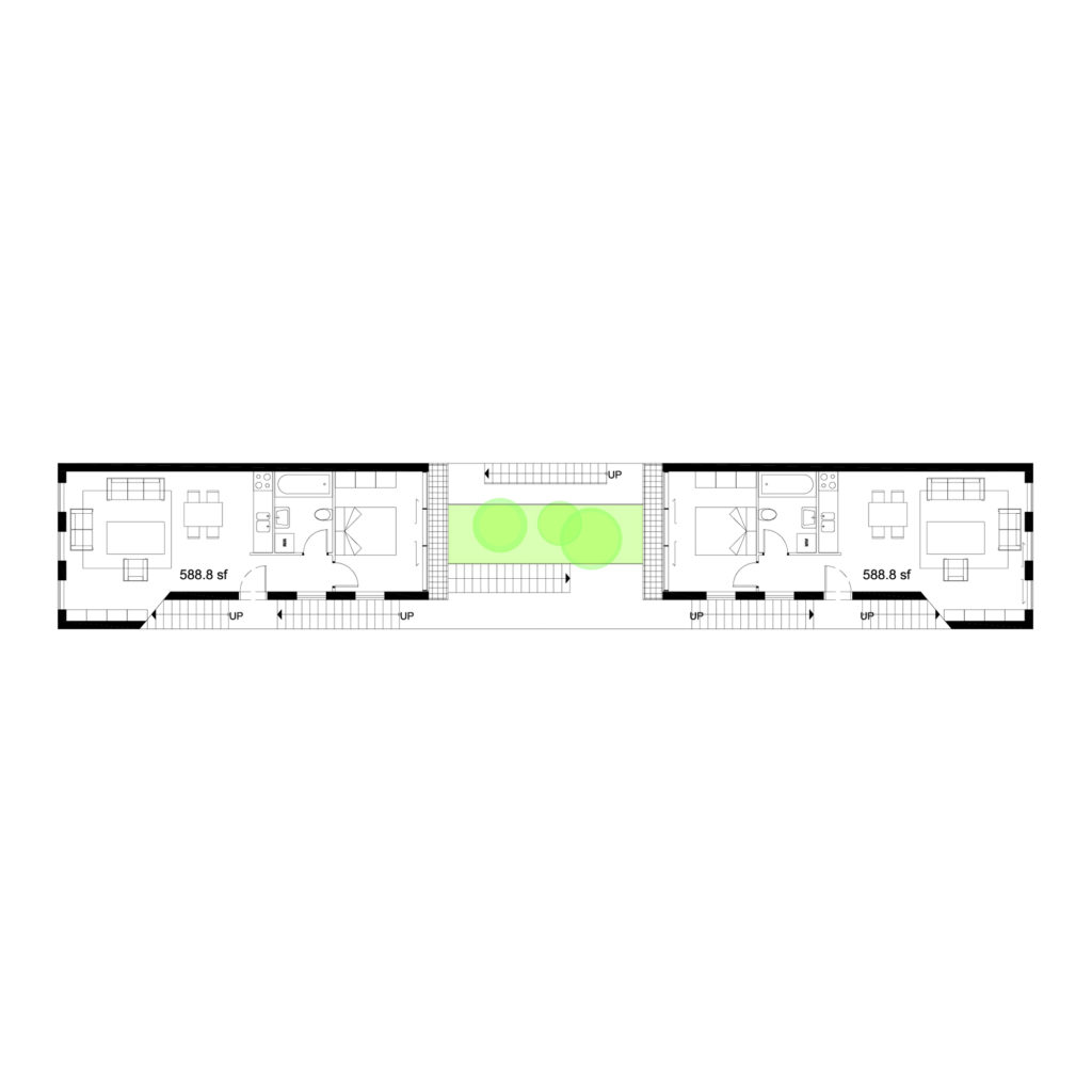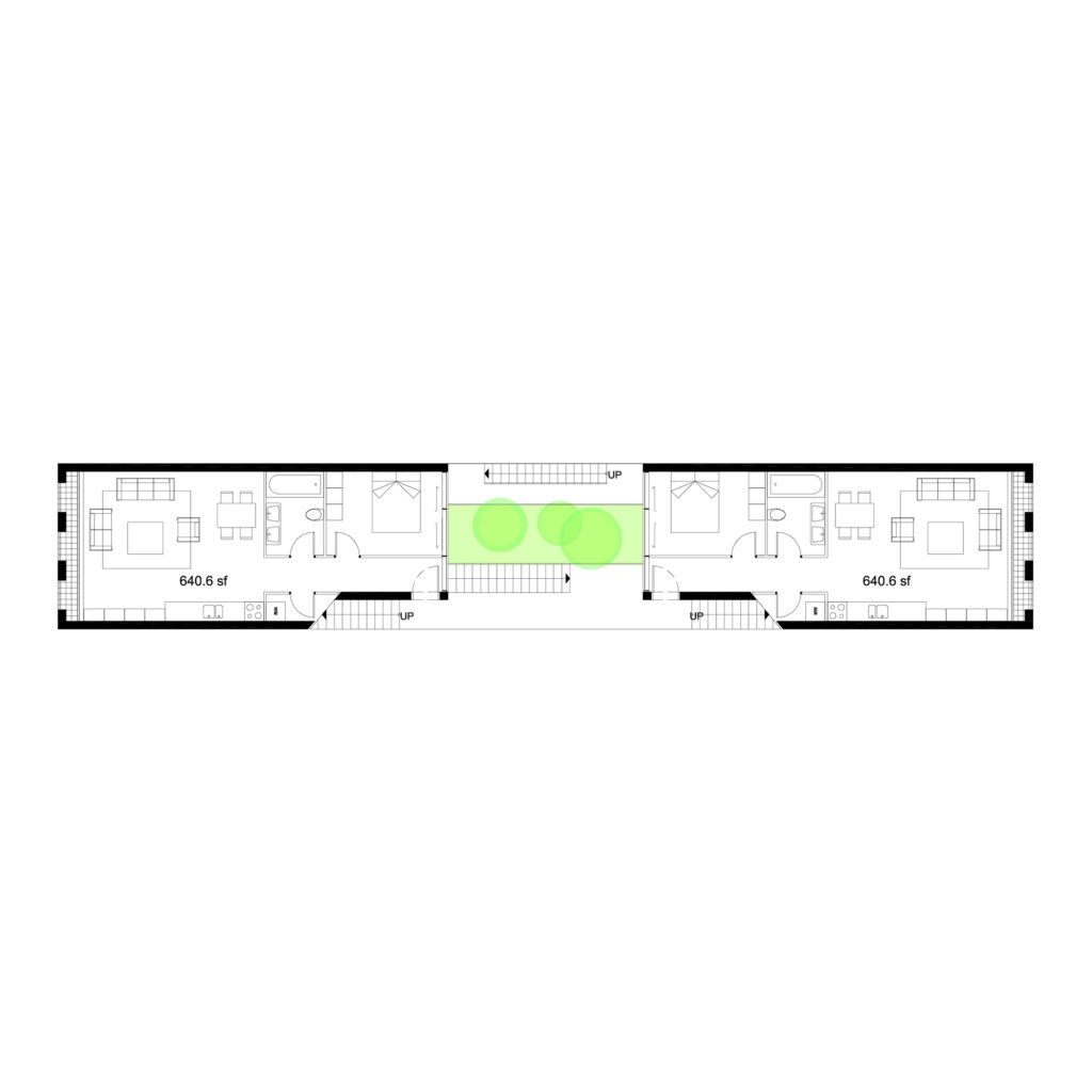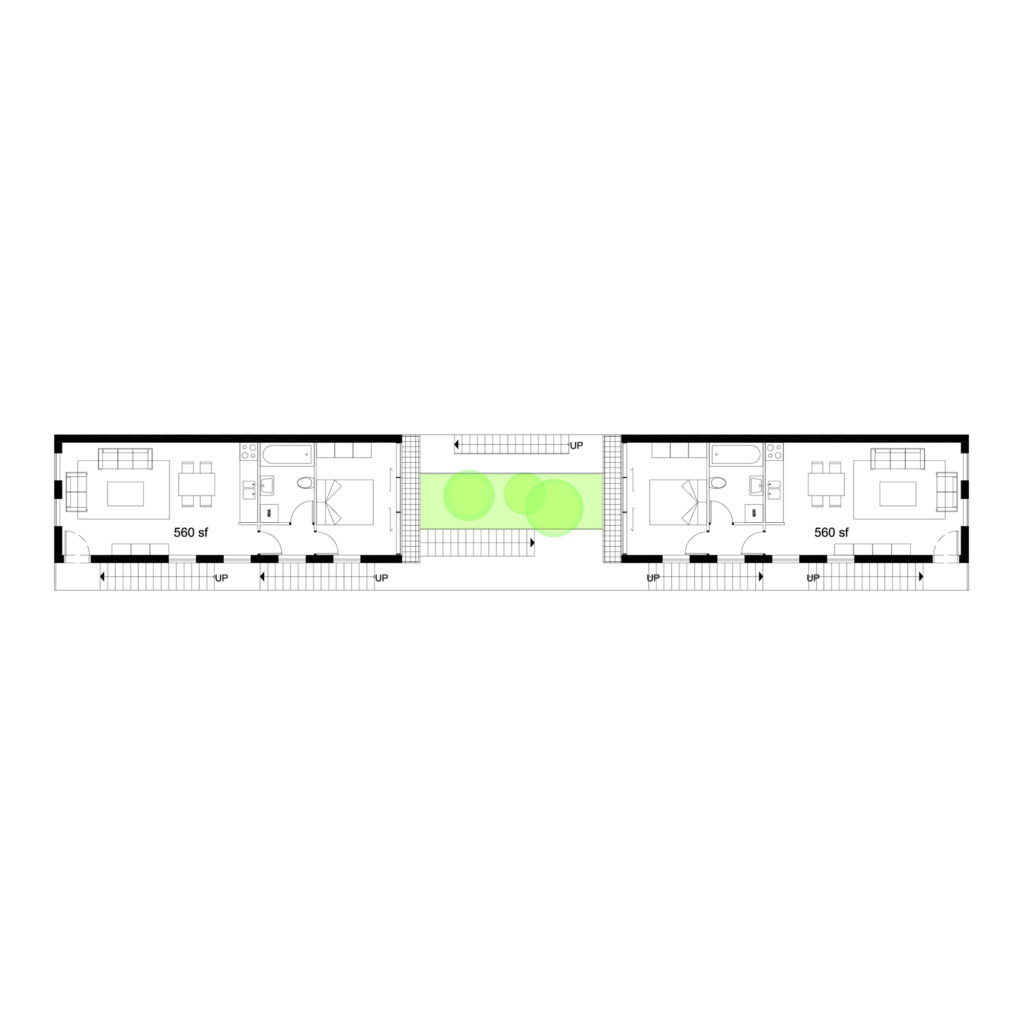 The main circulation of the building is pushed to the neighboring parti-wall. This cascading circulatory spine provides open-air vertical circulation and visual permeability through the creation of an interior façade. The courtyard created functions as welcoming arrival threshold which encourages active use and enhances the visual connection between spaces. “Between the Lines” explores small-home development strategy that aims at achieving quality and affordability while proposing two variations of layouts: One bedroom apartments of approximately 640 sq. ft. and duplexes of 1230 sq. ft.
