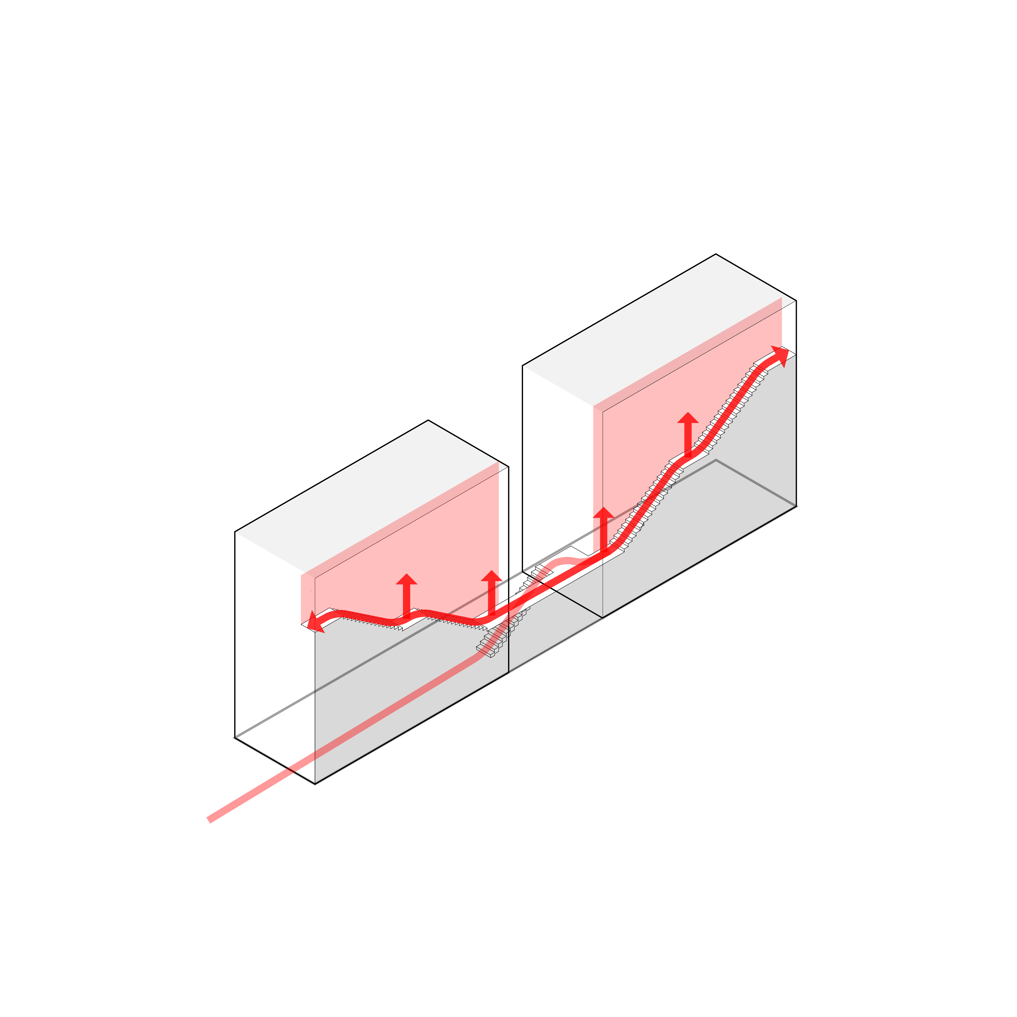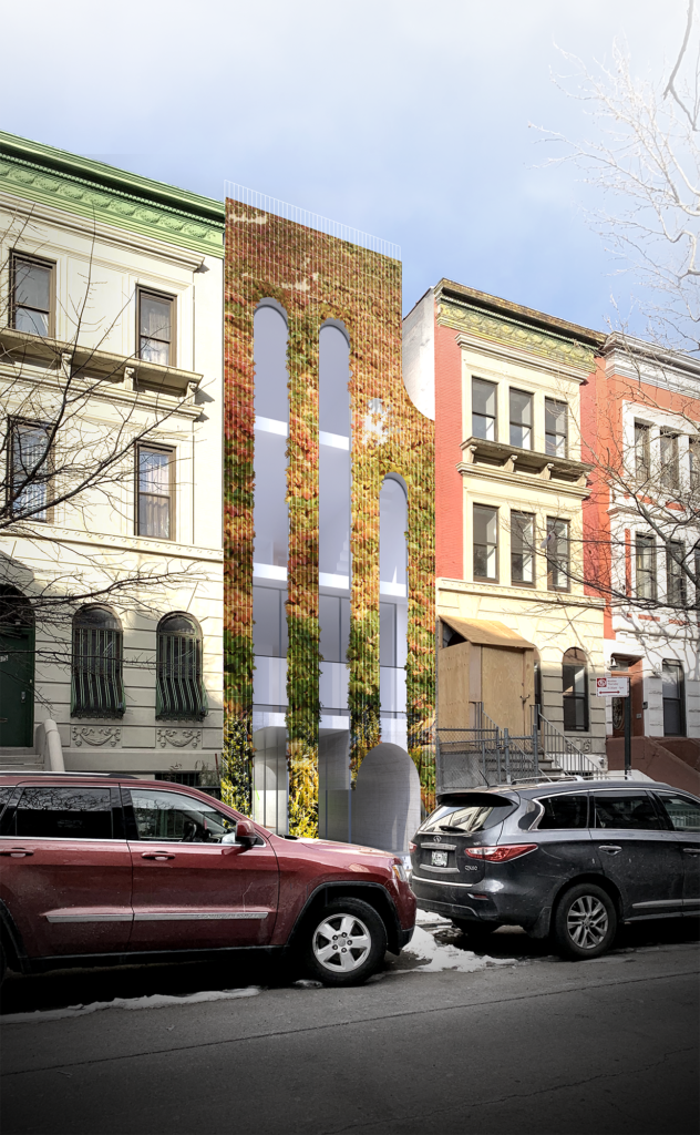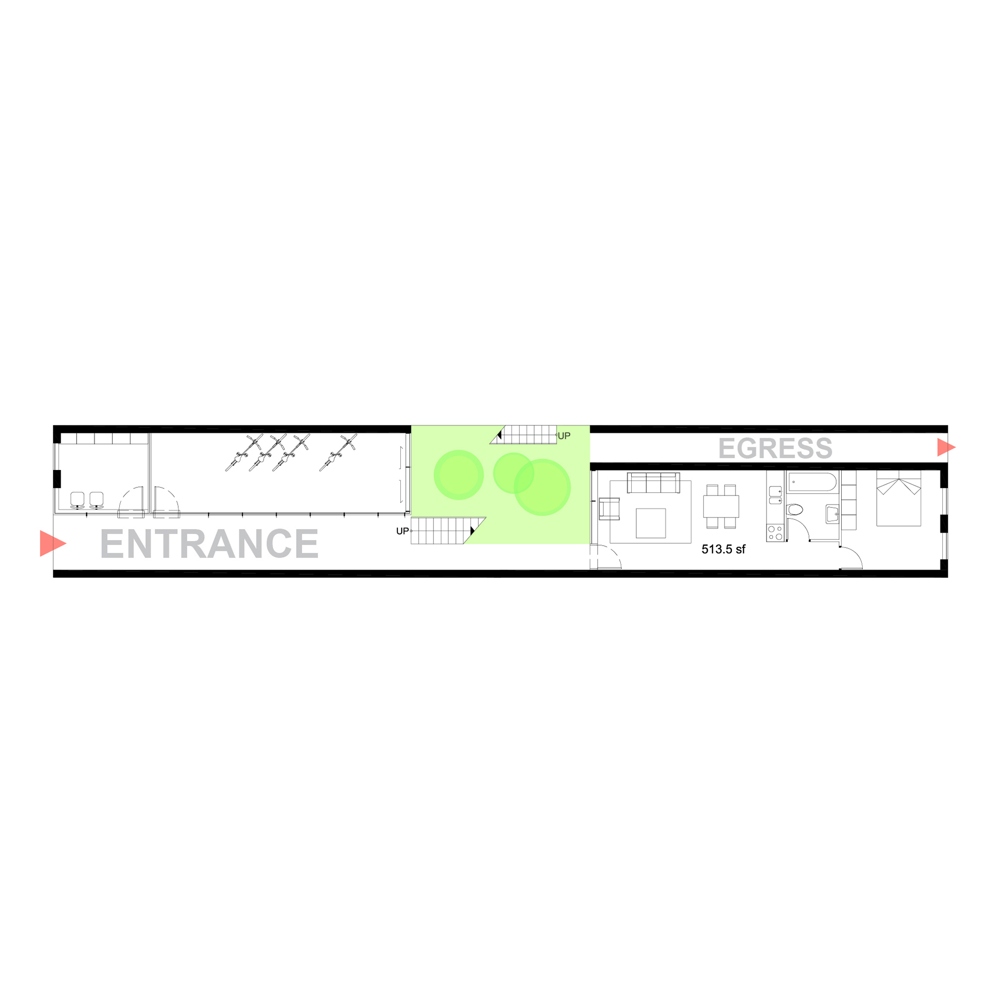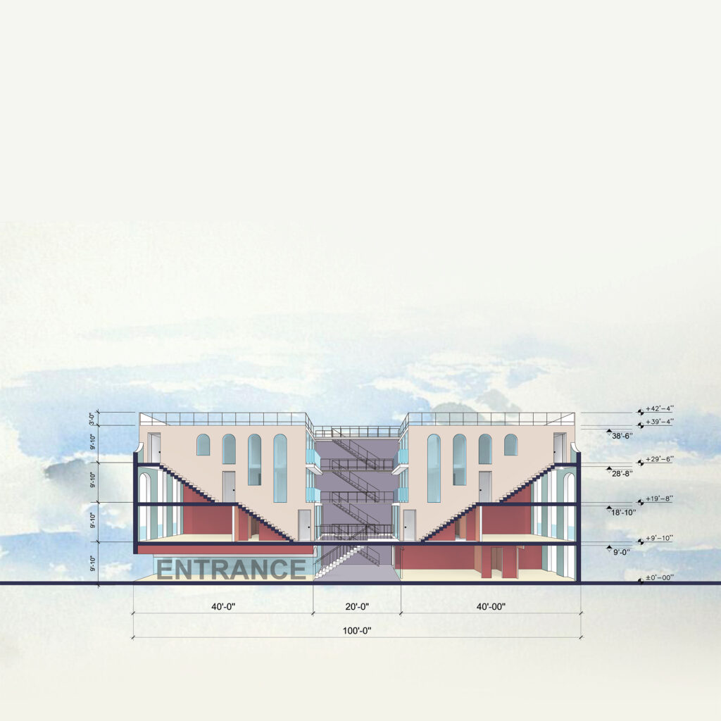 The main circulation of the building is pushed to the neighboring parti-wall. This cascading circulatory spine provides open-air vertical circulation and visual permeability through the creation of an interior façade. The courtyard created functions as welcoming arrival threshold which encourages active use and enhances the visual connection between spaces. “Between the Lines” explores small-home development strategy that aims at achieving quality and affordability while proposing two variations of layouts: One bedroom apartments of approximately 640 sq. ft. and duplexes of 1230 sq. ft.