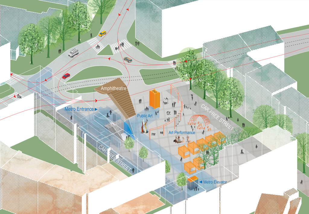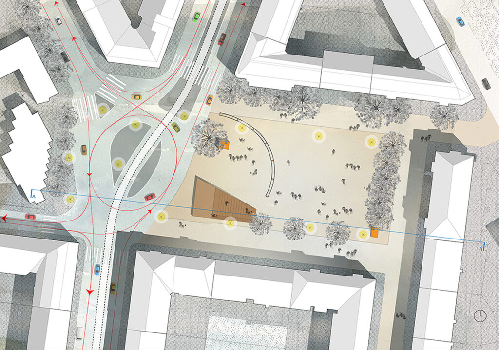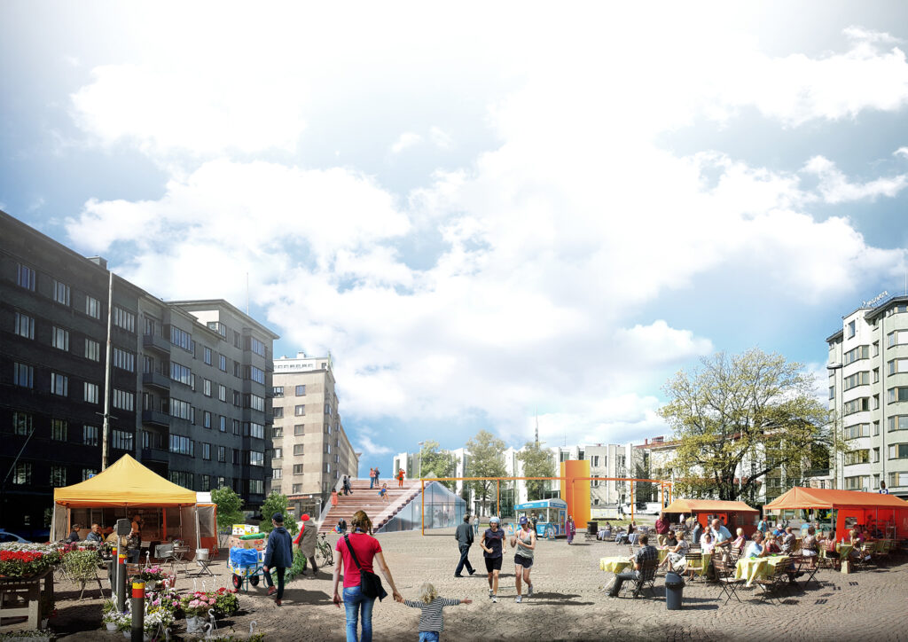 Artists, designers and architects alike must face the challenge of defining public space as an opportunity to create or improve the sense of community among those who will determine the use. In this respect, this proposal makes room particularly for public art as strong means of articulating the implicit values of Helsinki. To begin with, a proposed lightweight installation follows and revives the previous tram footprint aiming at preserving the memory of the old curved line.