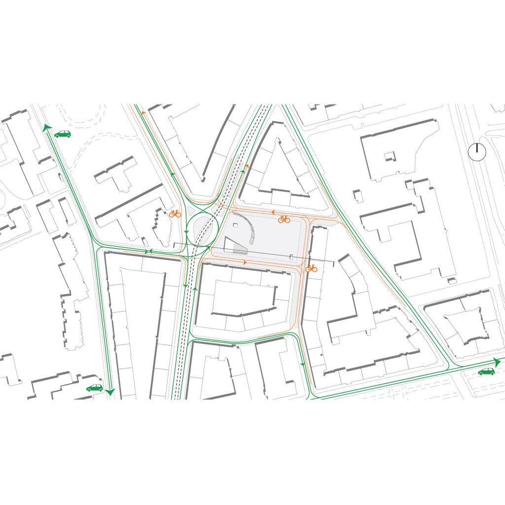 The open amphitheater would facilitate the public space while keeping the market and the cultural life running without intervening but rather completing one another. Further, the streets surrounding the square are proposed to be transformed to car-free while providing more space for pedestrians or cycling. This would bring people back to the square and allow for a larger variety of pubic activities. The process of expanding the pedestrian zone could be executed in phases, with parking spaces gradually removed and biking lanes improved.