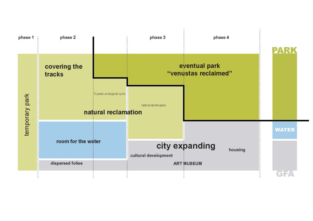 Venustas Reclaimed reflects a broader movement centered on sustainability, community enrichment, and cultural identity, and its transformations symbolize the city’s evolving future over the coming decades. The project is clearly structured into phases: The first phase responses to the most pressing needs like constructing a long-term water basin which will respond primarily to flooding due to increased runoff and the inability of the ground to absorb excess water. In subsequent stages, the train tracks will be covered and gradually transformed into a public park that directly dives into the urban heart of Hyllie. Repurposing infrastructure such as railways into green spaces offers an innovative way to integrate nature into the urban landscape. This transformation not only adds to a significant cultural landmark but also acts as a catalyst for economic growth. It is expected to attract tourism, stimulate real estate development, and support local businesses.